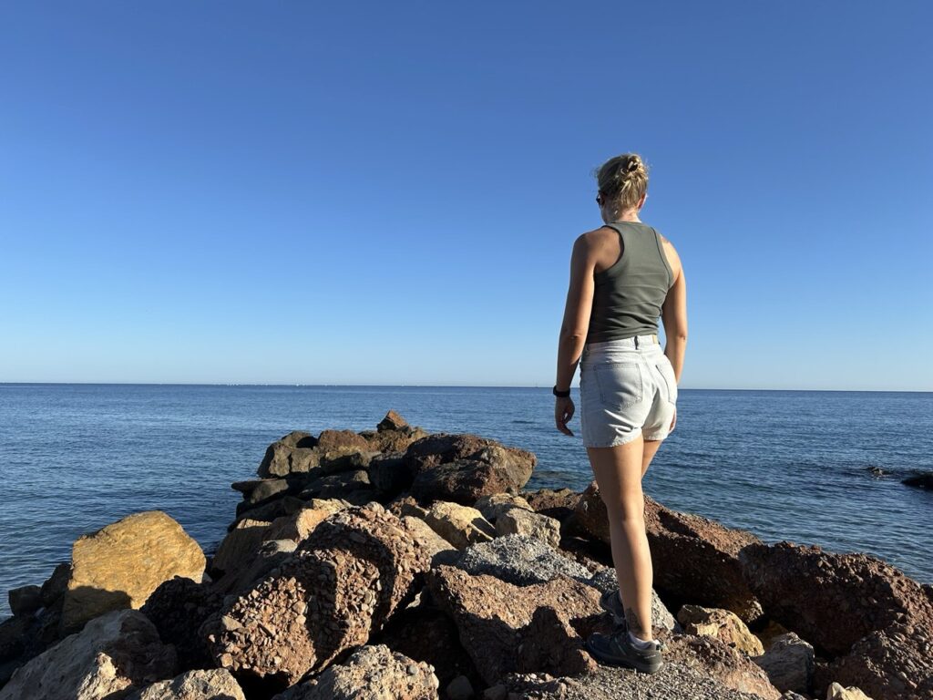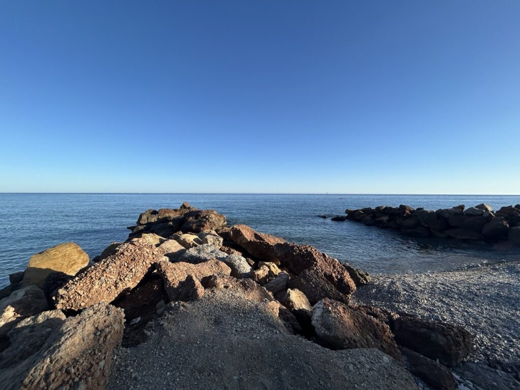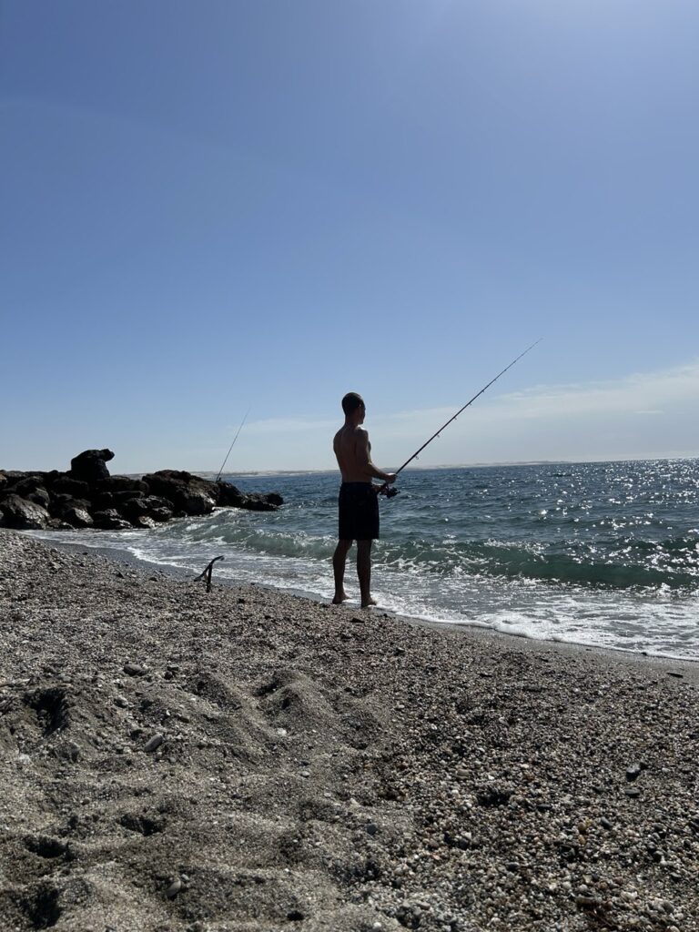 Am nächsten Tag versuchten wir unser Glück in einer der Buchten – bewaffnet mit einer Angel und viel Geduld. Der Strand ist steinig, aber mit vorsichtigen Schritten gut zu begehen. Am besten zieht man sich Strandschuhe an, vor allem wenn man ins Wasser geht.